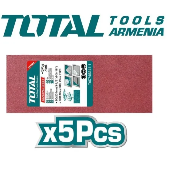TOTAL TAC749241 հղկող թերթերի հավաքածուն փոխարինող տարր է հղկող մեքենաների համար և օգտագործվում է փայտի , մետաղի վերամշակման , ներկի և լաքի ծածկույթների և ժանգի վերացման համար : Թիթեղները փորված են` հղկվող փոշին ավելի լավ հեռացնելու համար : Ձևը հարմար է փոքր տարածքների անկյունների և մակերեսների հղկման համար : Պատրաստված է գործվածքների վրա հիմնված ալյումինե օքսիդից :